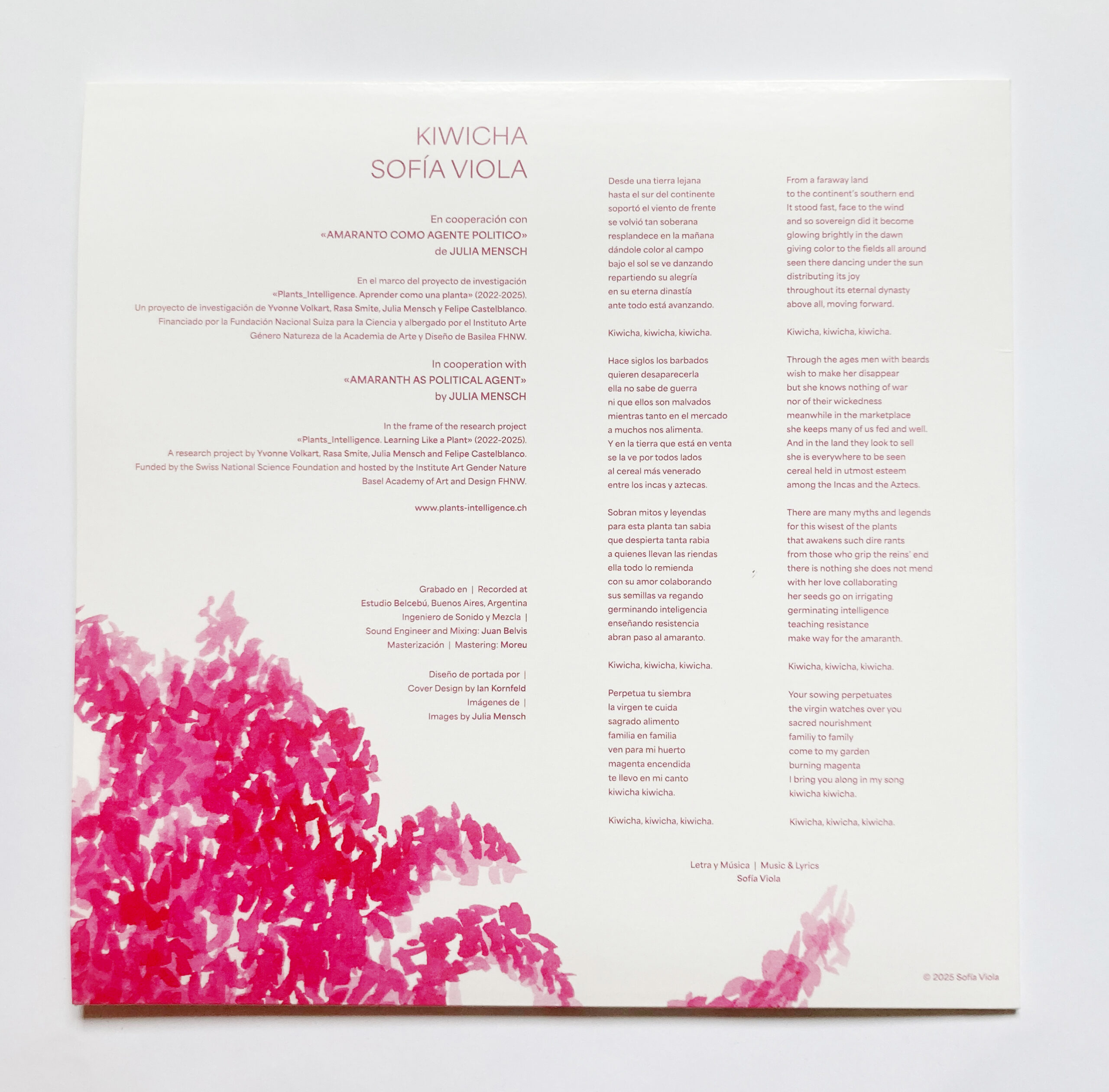 Over several months, I shared my research with the singer Sofía Viola, who planted amaranth at her home to observe its growth during the Argentine spring and summer. Sofía composed this piece based on her close observations of the plant and the insights from my artistic research.