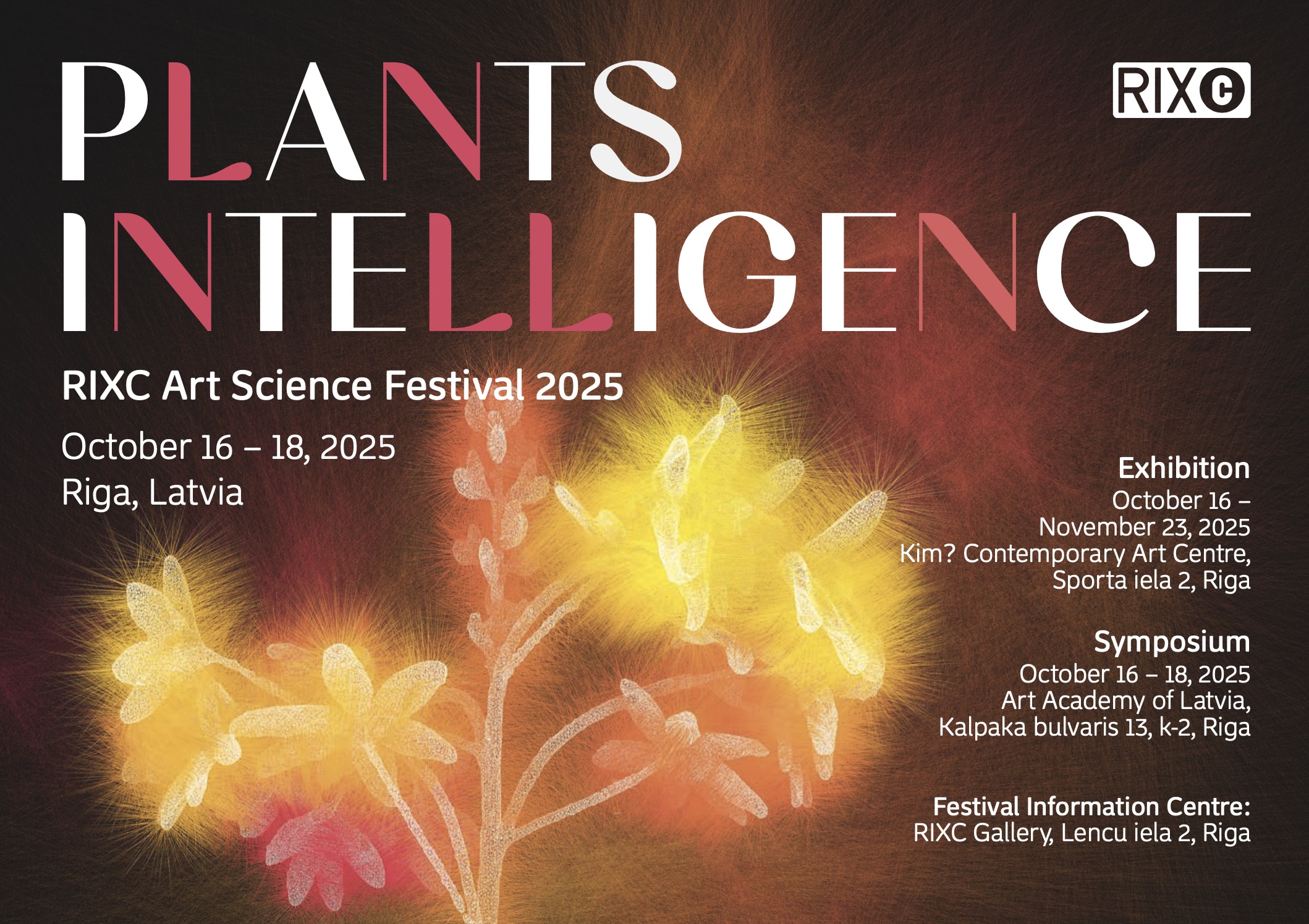 The main festival program will take place October 16–18, 2025, in Riga, featuring the opening of the Plants Intelligence exhibition at Kim? Contemporary Art Centre and a symposium at the Art Academy of Latvia, with artist talks, research presentations, film screenings, and live performances. It will also present the Resonances of Nature project with a workshop, an interactive sound installation and performance, created through French, German, and Latvian collaborations. Further highlights include XR showcases by artists from the RIXC Field Residency, Taiwan-based Zone Sound, and Karlsruhe’s NAIA, along with the Symbiotic Futures Baltic–Nordic meeting.