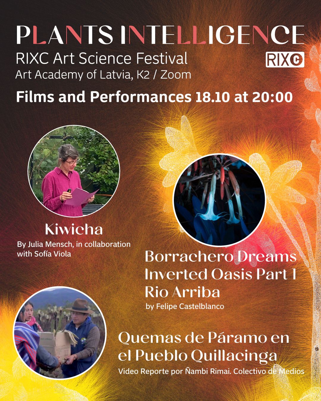 Felipe Castelblanco “Borrachero Dreams” (2025, 12 min), “Inverted Oasis Part 1” (2025, 13:00 min), “Rio Arriba” (2021, 14:00 min), Julia Mensch “Kiwicha” (performance-lecture, 18 min) and Sofía Viola (AR) in cooperation with Julia Mensch (video-song, 5 min), Video Reporte por Ñambi Rimai Colectivo de Medios “Quemas de Páramo en el Pueblo Quillacinga” (2022, 11 min), and others