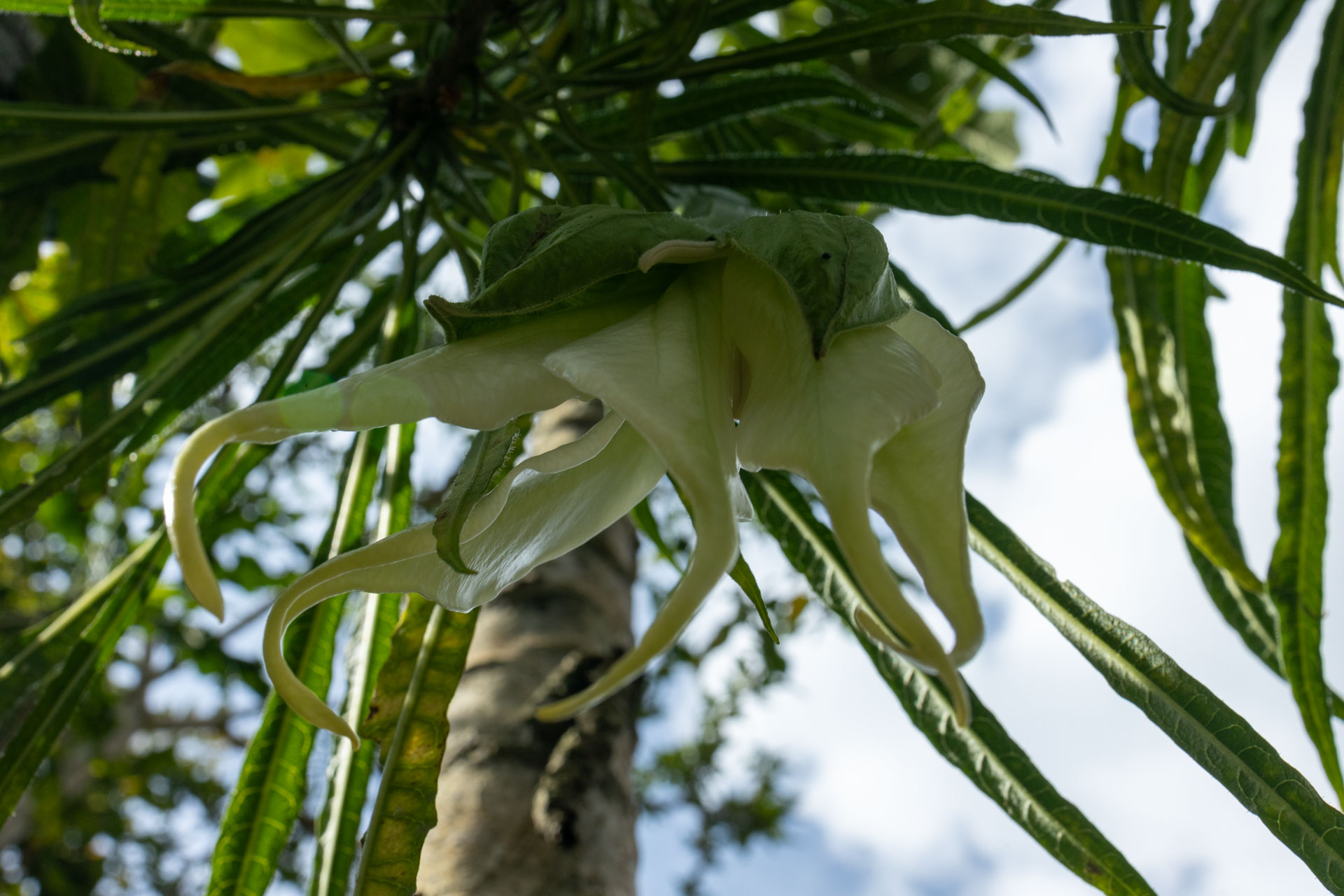 Ingesting -or even smelling it- can cause severe hallucinations and temporary loss of memory. In fact, the ancient Andaki tribes used the plant’s smell to deter Spanish Colonial armies before moving their ancestral villages to an alternative dimension of the forest, co-inhabited by invisible forest dwellers. This formless layer of the forest is only felt in misty days and through the smells of the jungle. Paradoxically, while Burgmansia flowers resemble indigenous resistance, they have also infiltrated European gardens since the XIX century with smells that transport the Andaki ① tribes through a backchannel of unintended colonization.